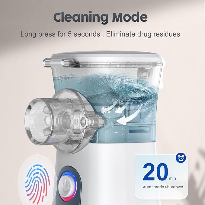 - ✅ جهاز استنشاق للبالغين والأطفال - يتميز جهاز الرذاذ الشبكي بوضع التنظيف الذاتي. اضغط مطولاً لمدة 5 ثوانٍ لتشغيل وضع التنظيف الذاتي (جميع المصابيح الثلاثة مضاءة)، والذي يمكن استخدامه للتنظيف اليومي لتجنب الانسداد.